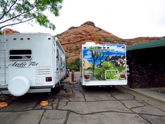 The little 31-site campground is situated in the beautiful red rocks, with wonderful views all around. But the 12 electric and water sites are extremely tight, even for our relatively modest 27’ trailer. When our neighbors pulled in for the night, they were no more than two feet from our door. We had to laugh when we looked out the window and suddenly had a view of Joshua Tree National Park—it was a mural painted onto the side of their rental RV.